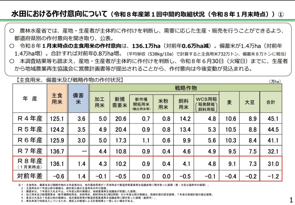 加えて、2024年8月頃に起きた「令和の米騒動」の影響で米価が高騰しましたが、2026年には供給量の回復とともに価格が落ち着きつつあります。農林水産省の発表では、2026年1月末時点の主食用米の作付意向面積は136.1万haと前年より0.6万ha減少しているものの、備蓄米の需要が増え、市場全体の需給バランスが変化しています。