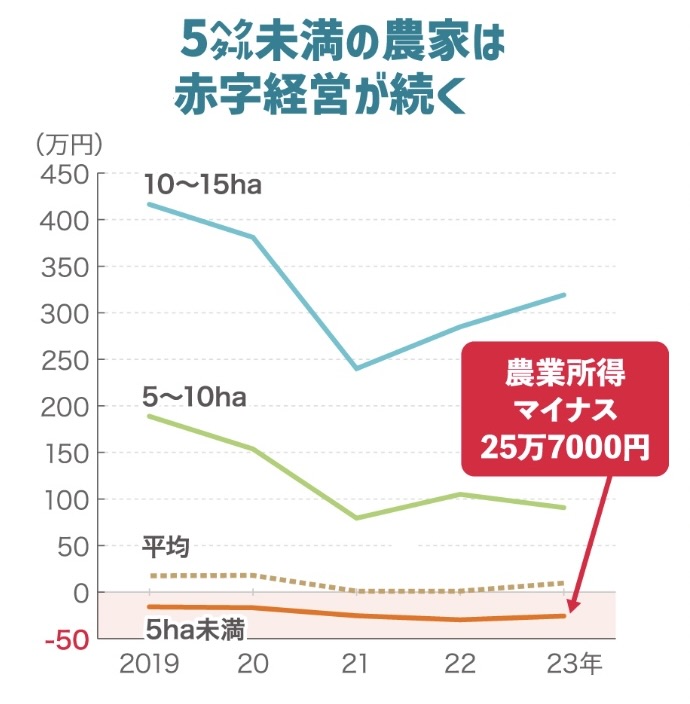 農林水産省のデータによれば、稲作単一経営では農業所得がマイナスになっているケースが多く、特に5ヘクタール未満の農家では慢性的な赤字状態です。一方、稲作に加えて別の作物や事業を組み合わせた「複合経営」の農家は、農業所得が大きく改善されています。