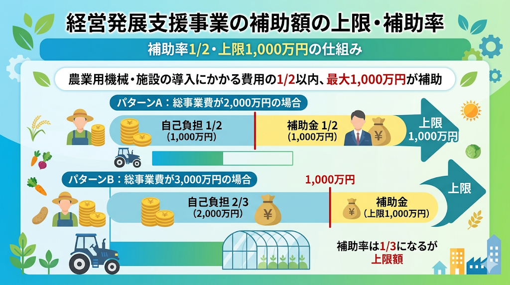 新規就農者育成総合対策の経営発展支援事業では、農業用機械・施設の導入にかかる費用の1/2以内、最大1,000万円が補助されます。