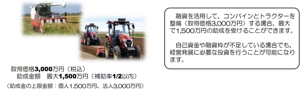 たとえば個人農業者が3,000万円の機械・施設を導入する場合、最大1,500万円が補助されます。残り1,500万円は自己資金または融資で賄うことになります。