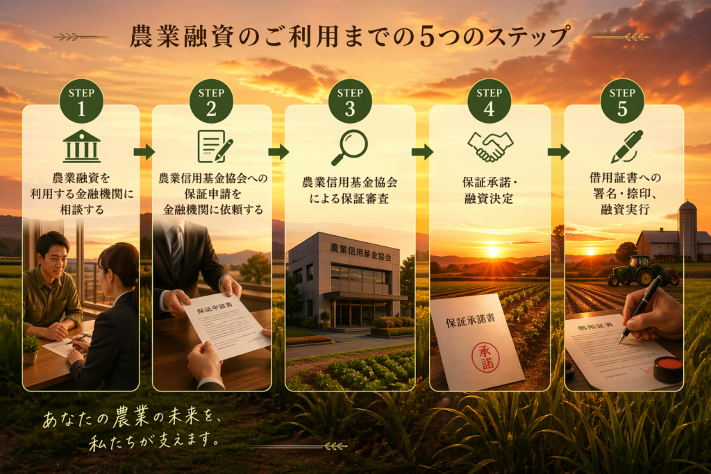 - 申請窓口: 農協・地方銀行・信用金庫等(金融機関経由で農業信用基金協会に申請)