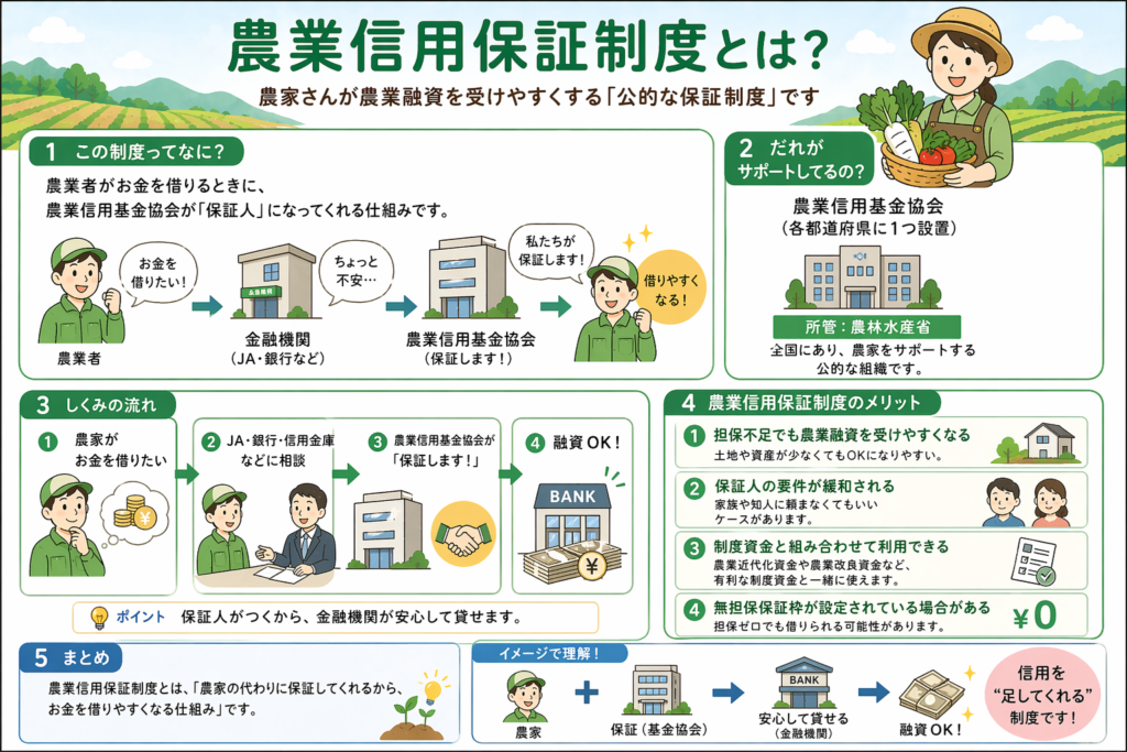 農業信用保証制度は、農業信用基金協会が農業者の債務を保証することで、担保不足の農業者でも農協・地方銀行・信用金庫等から農業融資を受けやすくする公的な保証制度です。