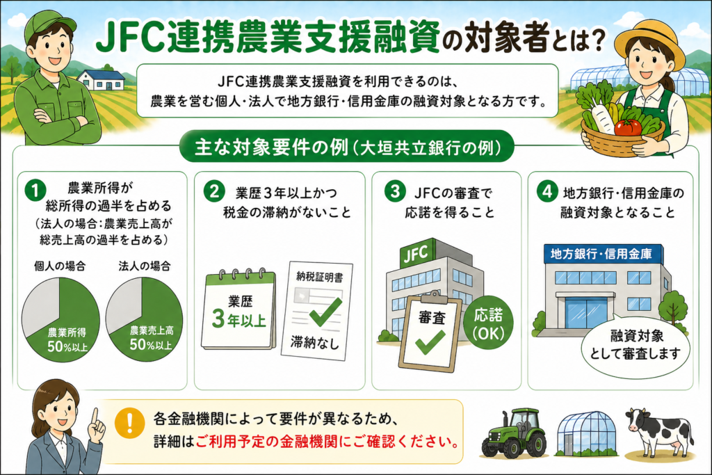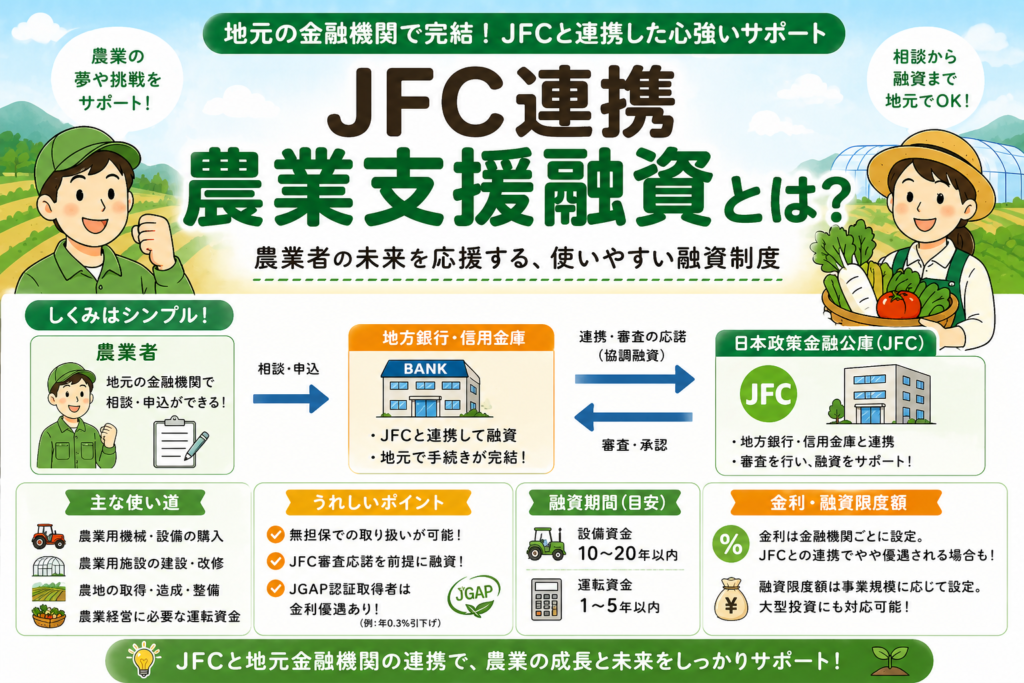 💡 ポイント: JFC連携農業支援融資は、地方銀行・信用金庫がJFCと連携しているため、JAに組合員として加入していなくても利用できます。JA組合員でない農業者にとって使いやすい農業融資の選択肢です。