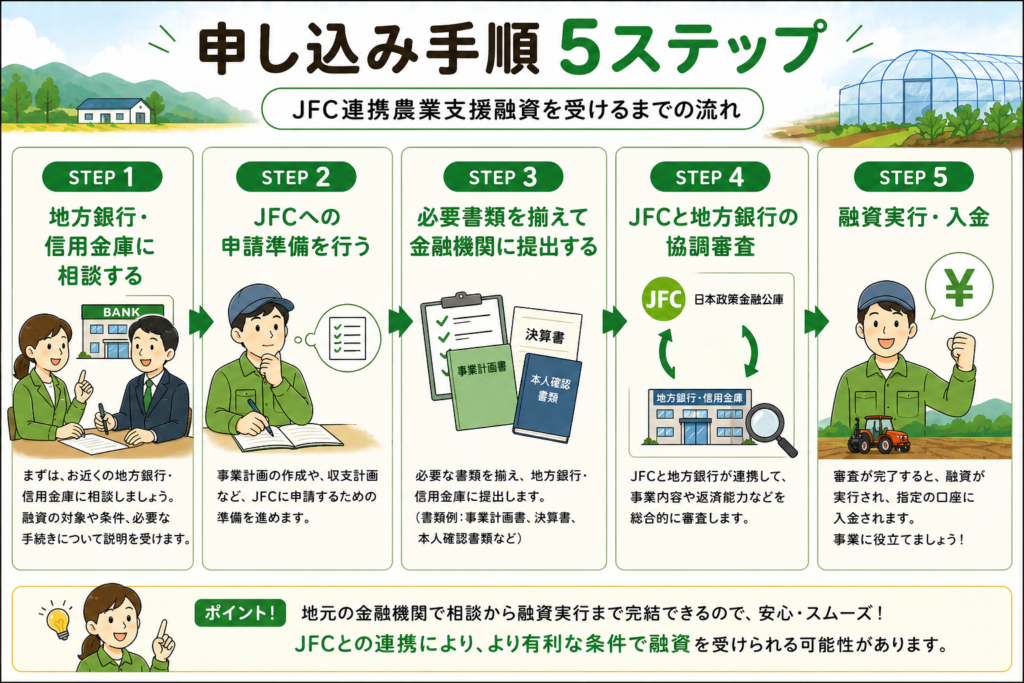 • 申請窓口: 地方銀行・信用金庫(JFC連携農業支援融資を取り扱う金融機関)