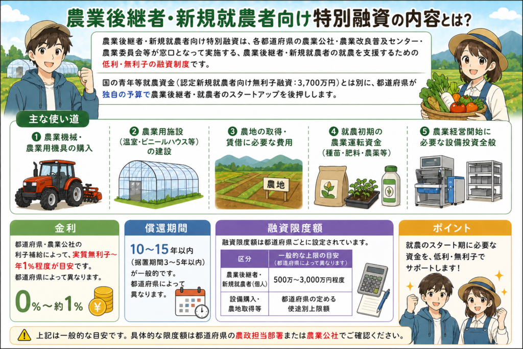 農業後継者・新規就農者向け特別融資は、都道府県農業公社等が窓口となる都道府県独自の農業スタートアップ融資です。国の青年等就農資金(無利子)と組み合わせることで、就農初期の資金不足を補えます。
