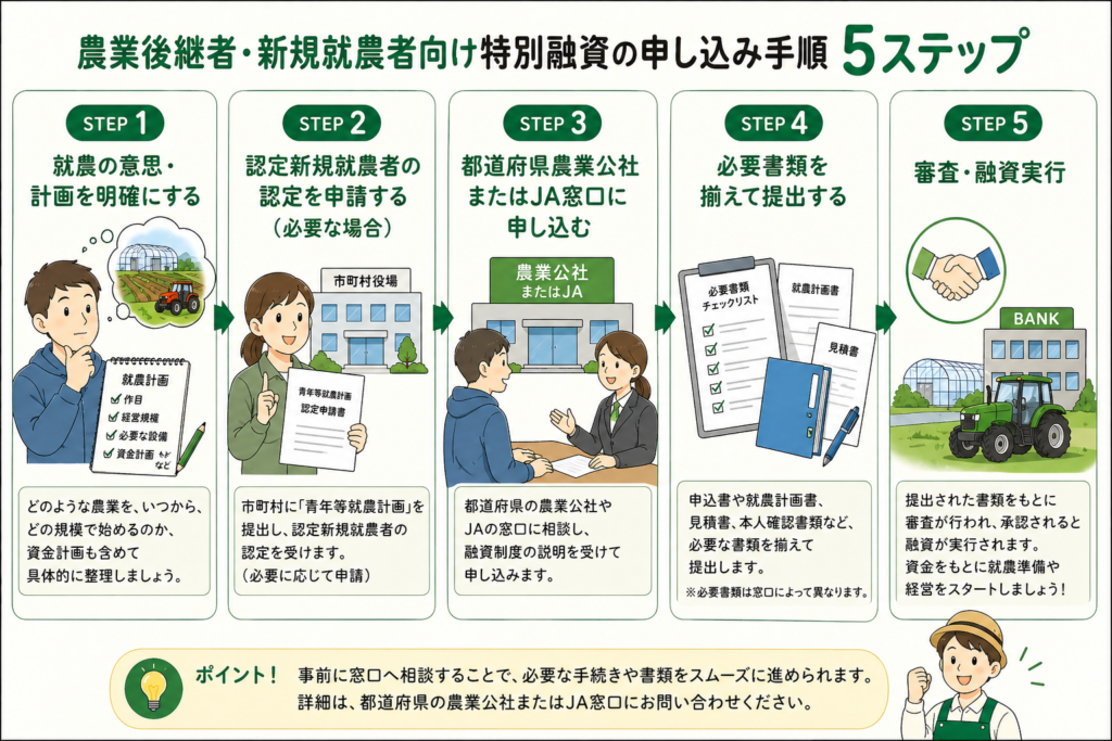 - 主な必要書類: 借入申込書・青年等就農計画書の写し・就農計画書・見積書等