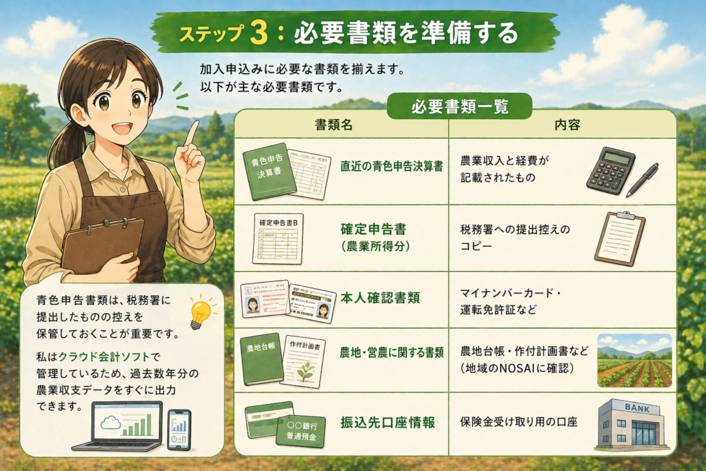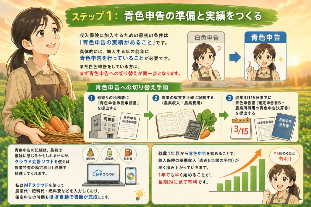 収入保険への加入は「青色申告の実績づくり→NOSAI相談→書類準備→申込み→掛金支払い」の5ステップで進められます。最大のハードルは青色申告の実績を作ることです。就農したら早めに青色申告を始め、収入保険加入の準備を整えておきましょう。