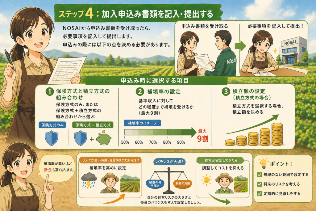 NOSAIから申込み書類を受け取ったら、必要事項を記入して提出します。申込みの際には以下の点を決める必要があります。
