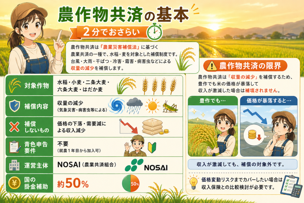 農作物共済(水稲・麦)の基本:対象作物と補償の範囲を2分でおさらい