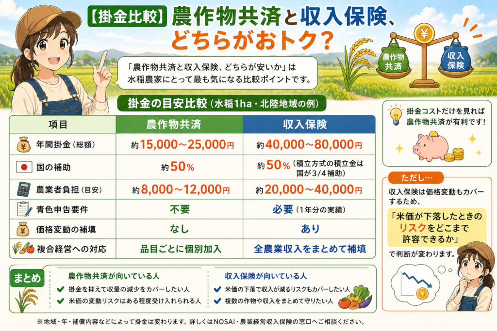 「農作物共済と収入保険、どちらが安いか」は水稲農家にとって最も気になる比較ポイントです。